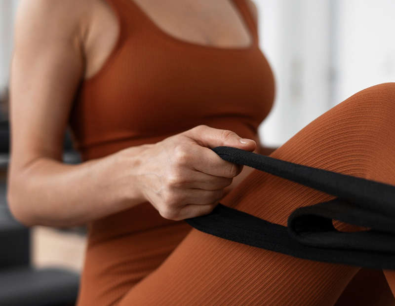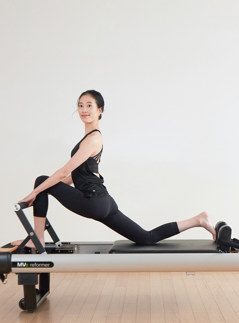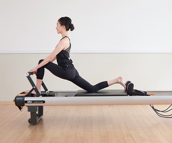 ストレッチリフォーマーピラティスの基礎となるポーズが多くでてきます。肩や股関節に意識を向ながら全身の血流を促します。